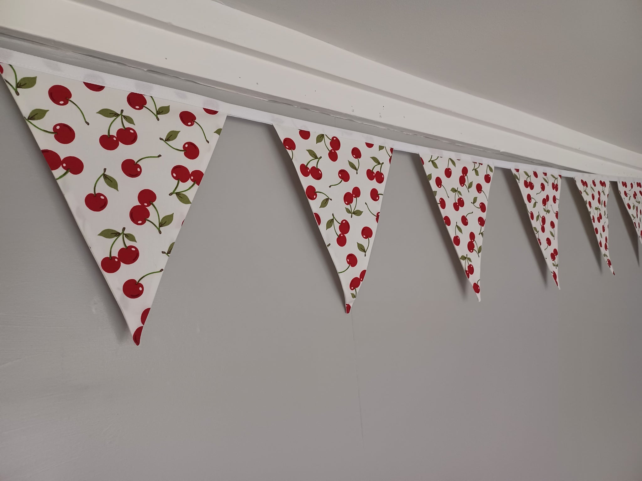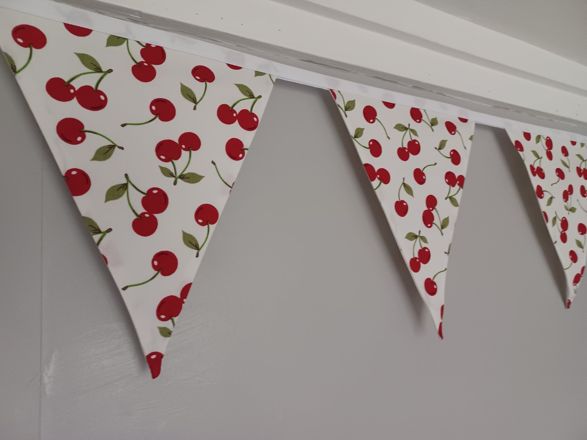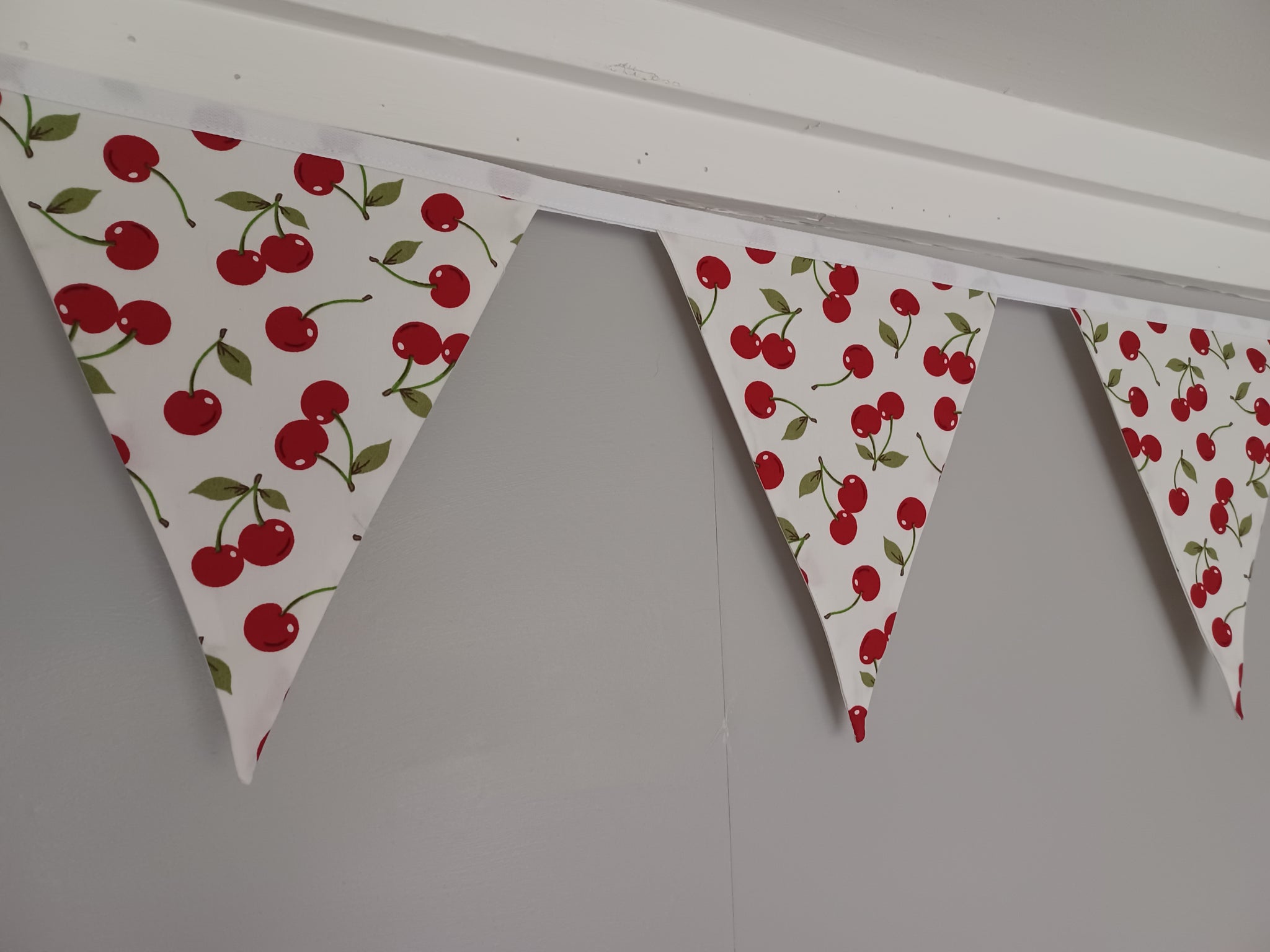 Bold red cherry design on an ivory cotton fabric. 10 handmade bunting flags sewn on to approx 2.5 metres of cotton tape. Plain ivory polycotton on the reverse.