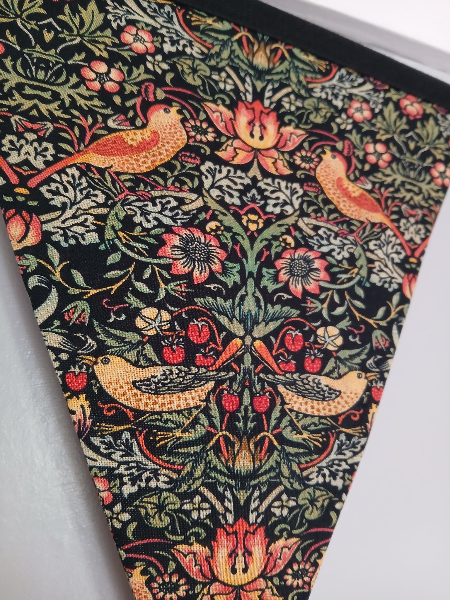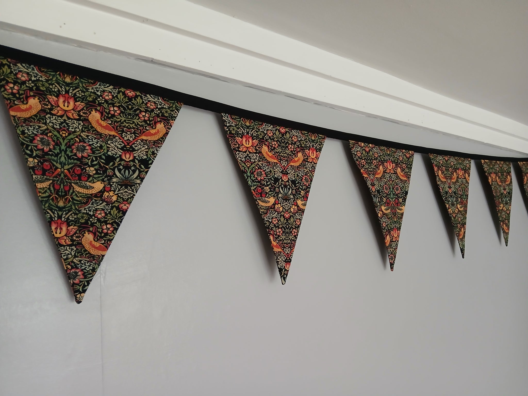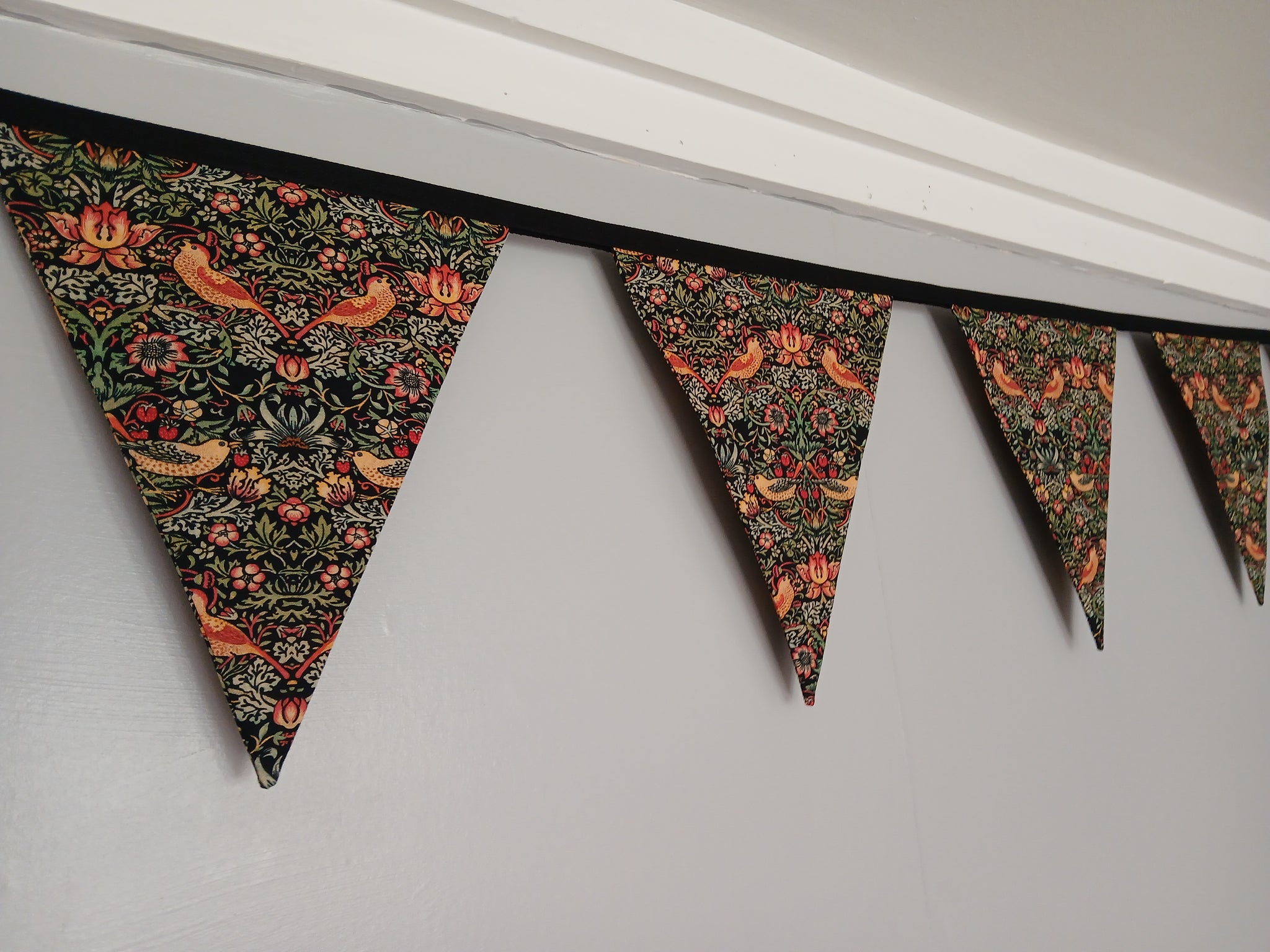 10 handmade bunting flags sewn on to approx 2.5 metres of cotton tape.